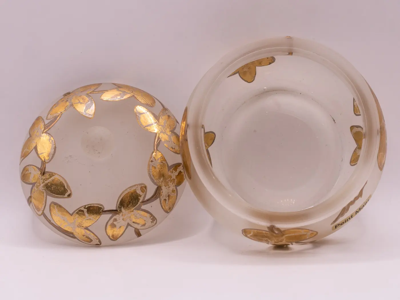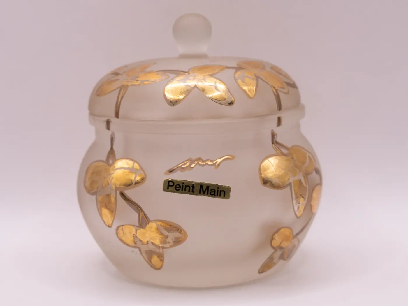 #boiteabijoux #potenverre #decorationdoree #peintmain #motiffeuilles #rangementbijoux #poudrier #artisanat #cadeaufemme #verredore