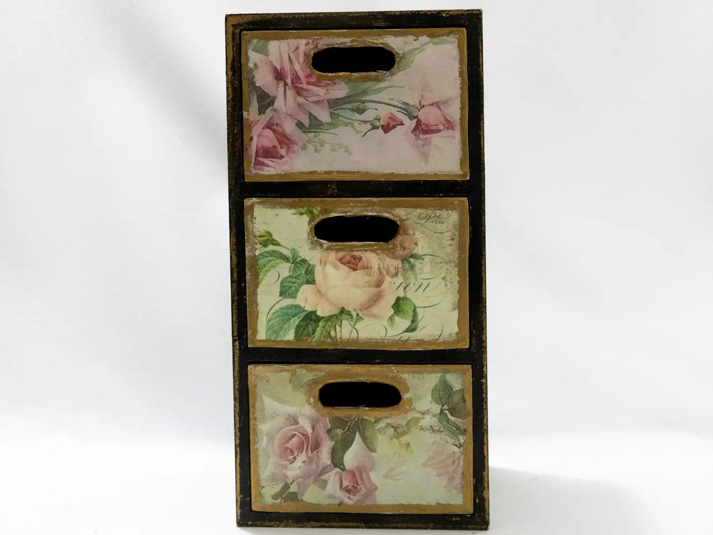 Boîte de rangement vintage en bois avec trois tiroirs floraux