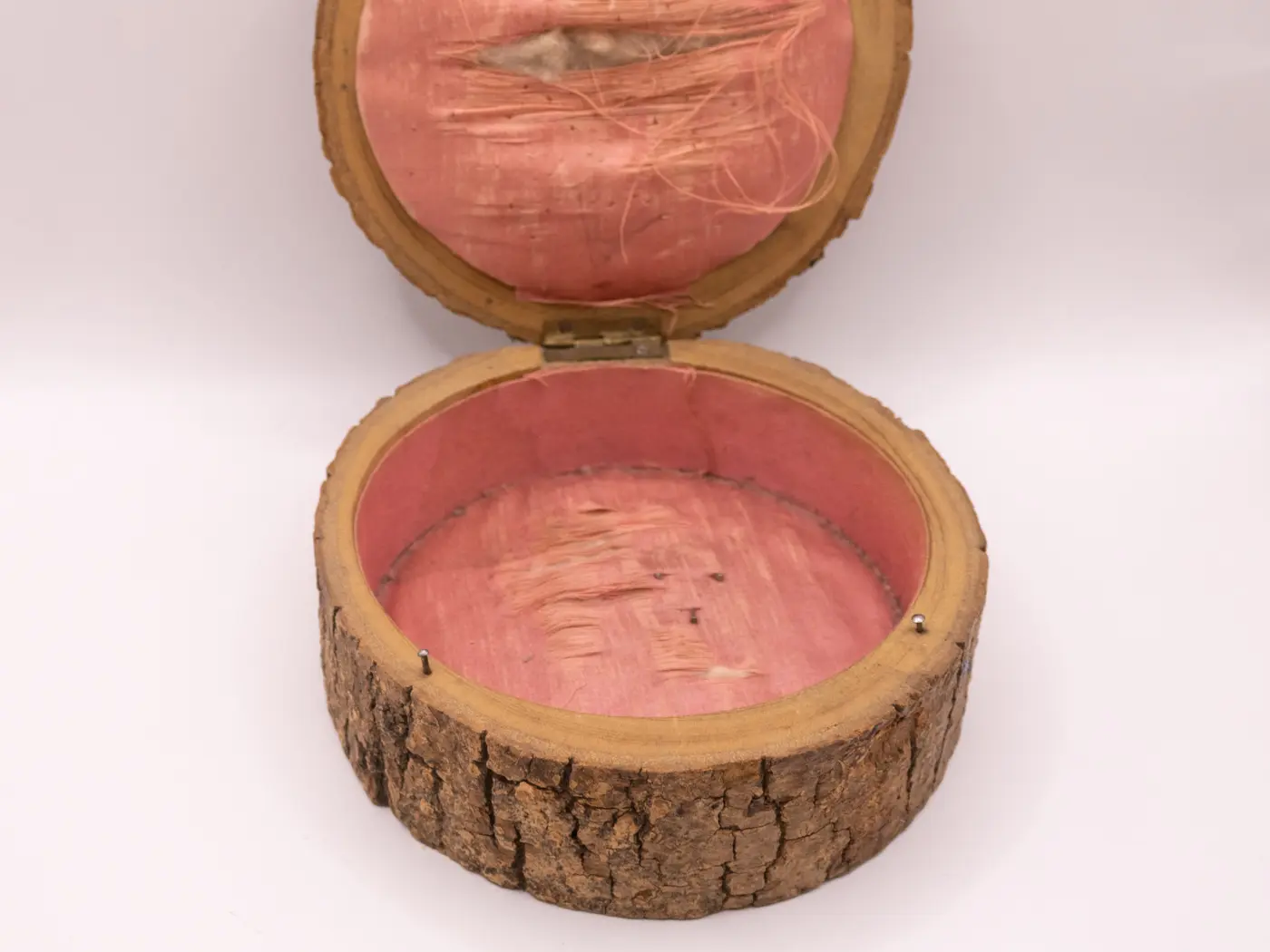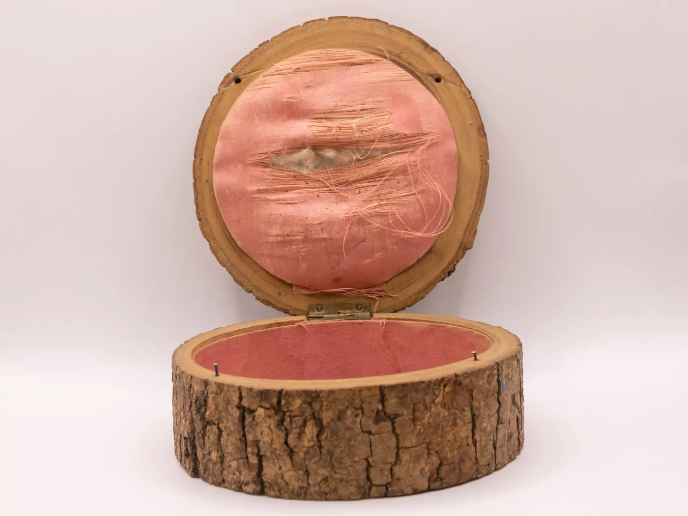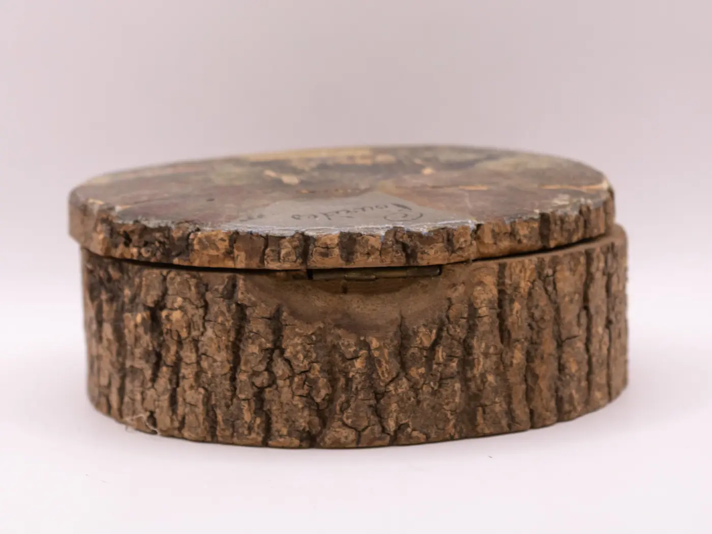 Cette charmante boîte en forme de rondin de bois est une pièce de caractère. Son couvercle est orné d’une délicate peinture à la main, signée ‘Lourdes’, qui lui confère une touche artistique unique et un souvenir authentique. L’intérieur, doublé d’un tissu rouge, présente une déchirure qui ajoute à son charme vintage et témoigne de son passé. Parfaite comme petite boîte à secrets ou comme objet de décoration, cette pièce en bois saura séduire les amateurs d’artisanat et d’objets pleins d’histoire.