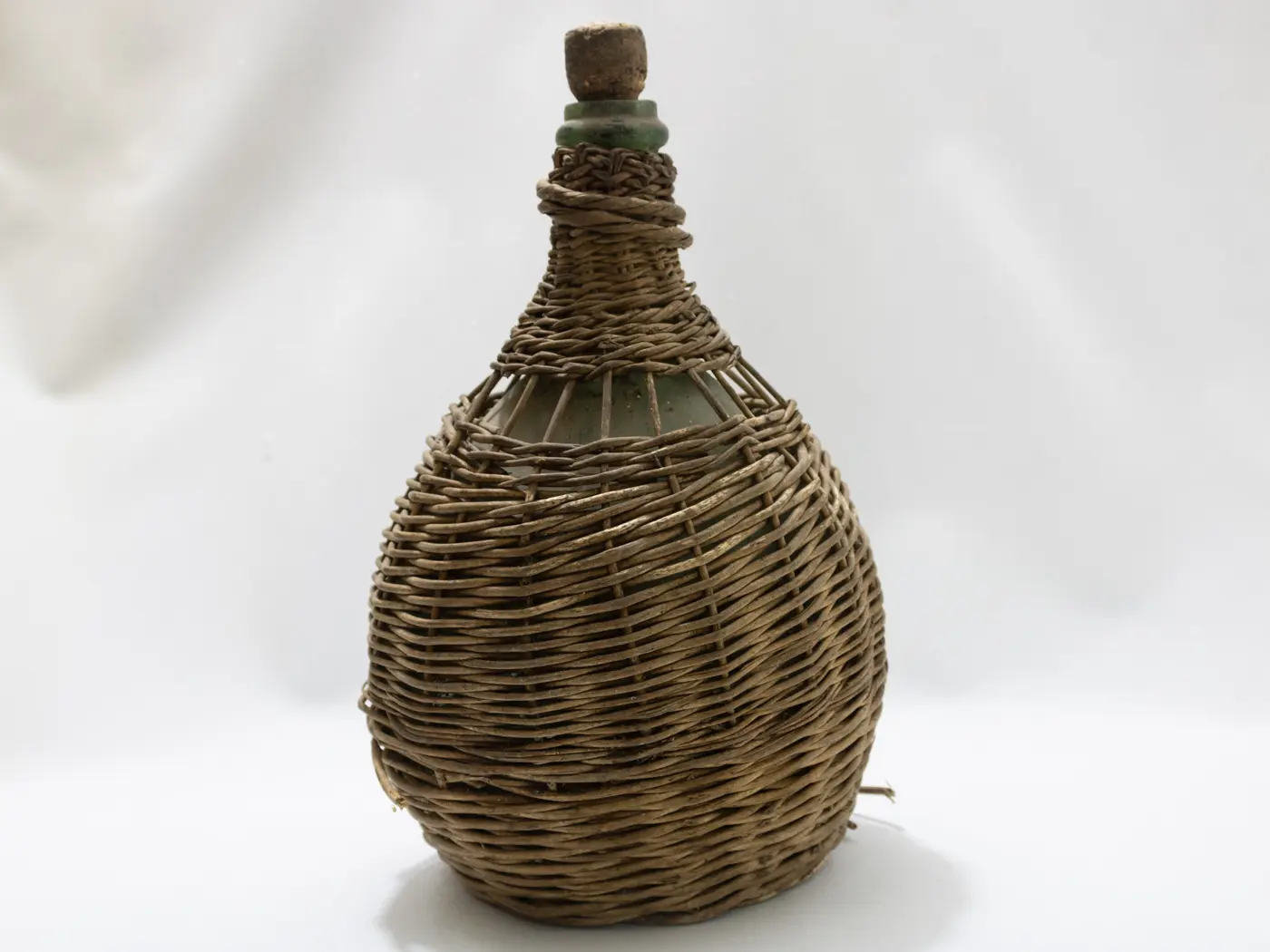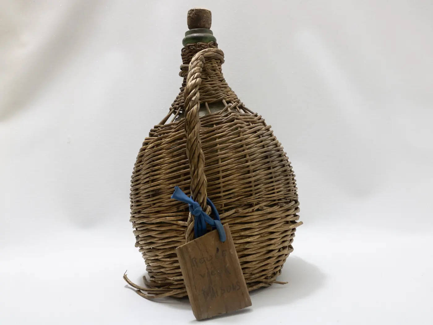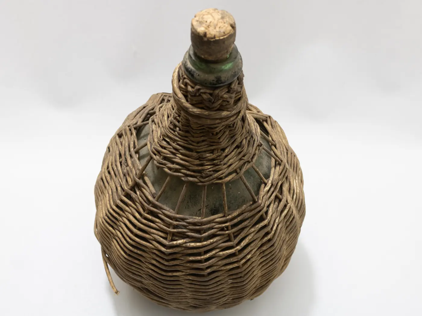 Dame-Jeanne ancienne en verre soufflé et habillage osier tressé