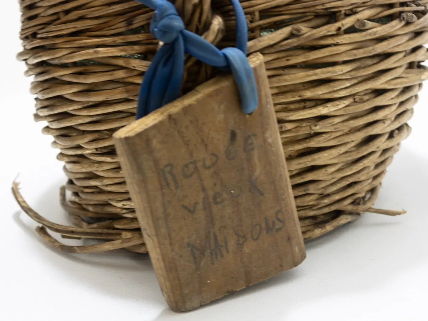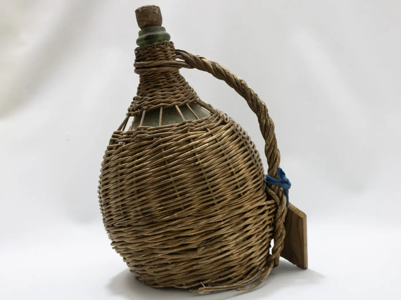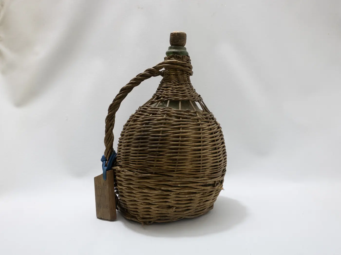 Dame-Jeanne ancienne en verre soufflé et habillage osier tressé