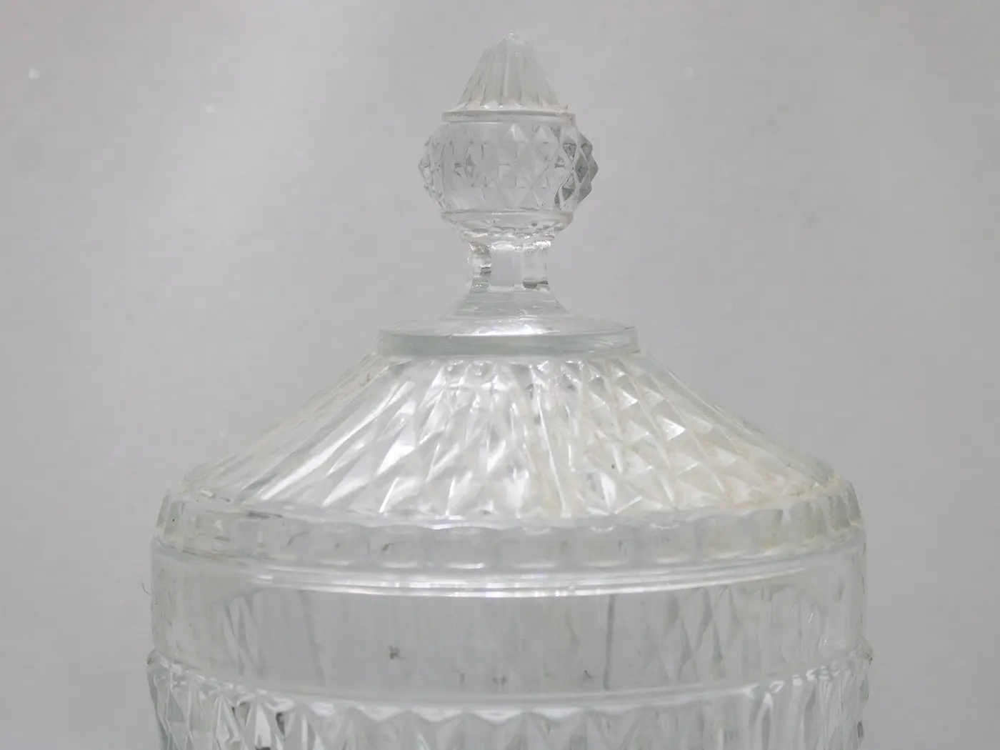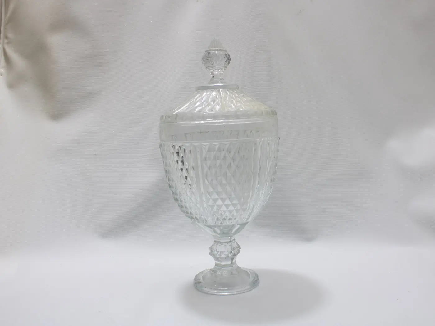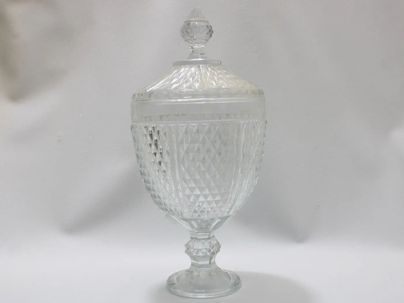 Majestueuse bonbonnière vintage en verre pressé motif diamant
